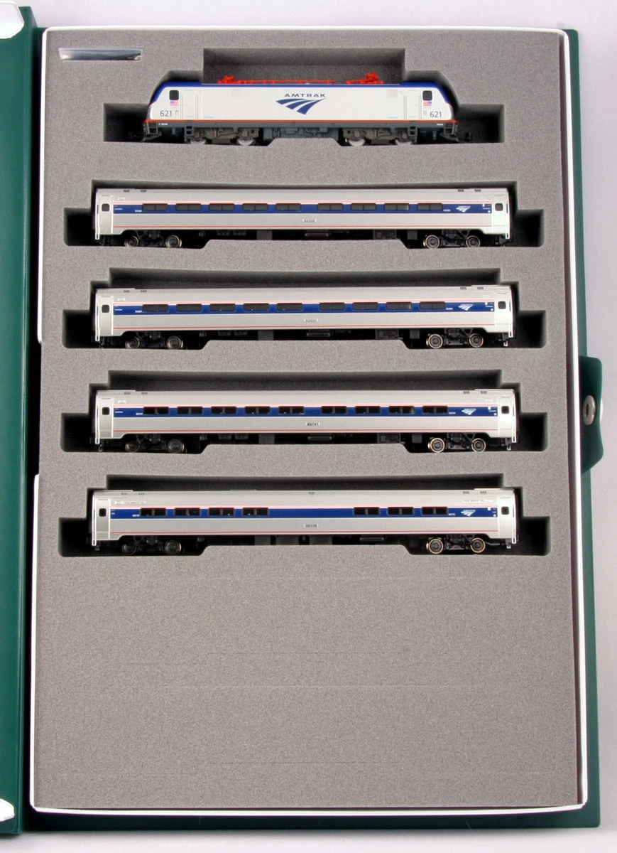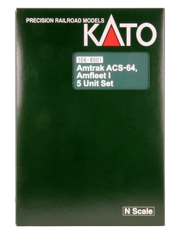 This set comes packaged in Kato’s bookcase style packaging and includes the ACS-64 locomotive and four Amfleet I Cars, tooled specially for this release.