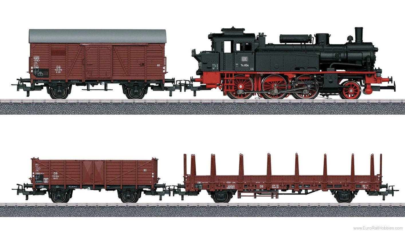 German Federal Railroad (DB) class 74 tank locomotive, type Om 12 gondola, type Gr 20 boxcar, and type Rlmms 56 stake car.