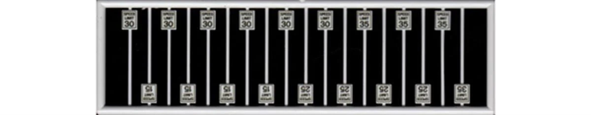 These are speed limit signs. 4 each of 15, 25, 35 mph & 6-30 mph. They are molded in off-white styrene with black printing. 18 total pieces.