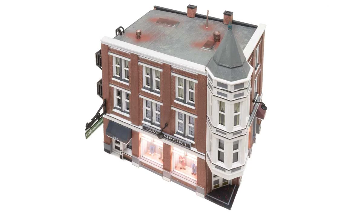 The classic Victorian architecture of Davenport Department Store, with its two-story corner turret, will dress up any downtown layout scene. Large first-floor picture windows feature mannequins and second and third floor windows feature a variety of window treatments. Building details include full roof detail, wrought-iron balconies and fire escape, signage, awnings and light fixtures. See photos for footprint.