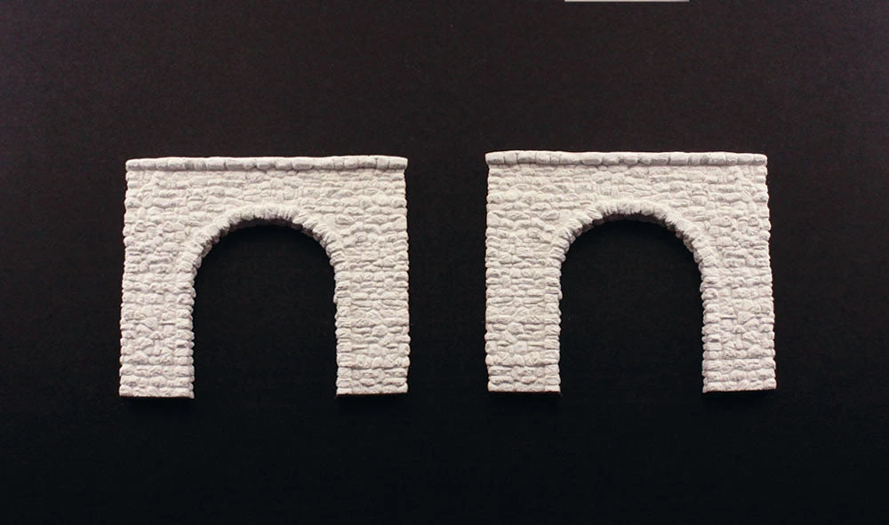 Detail your N Scale right-of-way with this assortment of authentic tunnel portals. They’re based on common railroad designs used on roads large and small in both the steam- and diesel eras. Each is an accurately scaled replica, cast in high density Hydrocal(R). Instructions for installation are also provided. For more realism, the castings are easily stained or painted with Woodland Scenics Earth Color Liquid Pigments, sold separately. Each package includes two matching portals.
