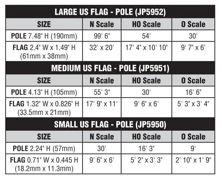 Show off your patriotism with Old Glory waving in the wind. US Flag – Poles are available in three sizes and work for multiple scales. They feature a United States flag high on a flag pole. The pole is topped with a ball-style finial and includes a rope and cleat. Display your flag outside large businesses, government buildings, schools and more.